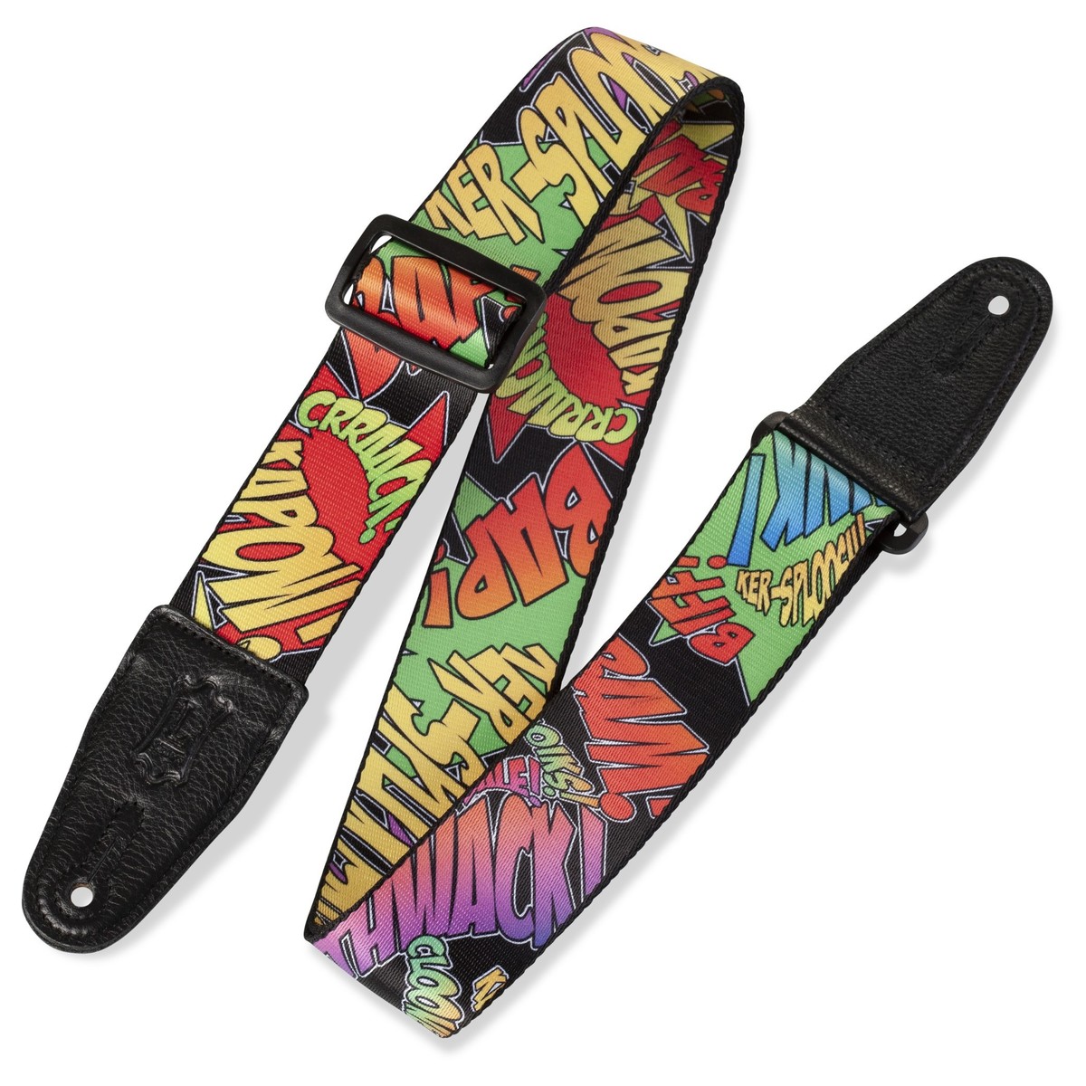 The Levys Sublimation Series Polyester 2″ is a stylish and durable guitar strap that is perfect for musicians who want to make a statement. Made from high-quality polyester material and featuring a comic book onomatopoeia design it is sure to turn heads wherever you go. The ends of the strap are made from leather adding a touch of sophistication and ensuring that your guitar is securely attached. With its 2″ width and adjustable length of up to 59.5″ the Sublimation provides a comfortable and secure fit for players of all sizes. The tri-glide slide adjustment ensures that you can easily customise the length to your preference making it suitable for both electric and acoustic guitars. Not only does this Levys strap provide practicality but it also allows you to express your personal style. The perfect blend of style and durability for a rocking performance.