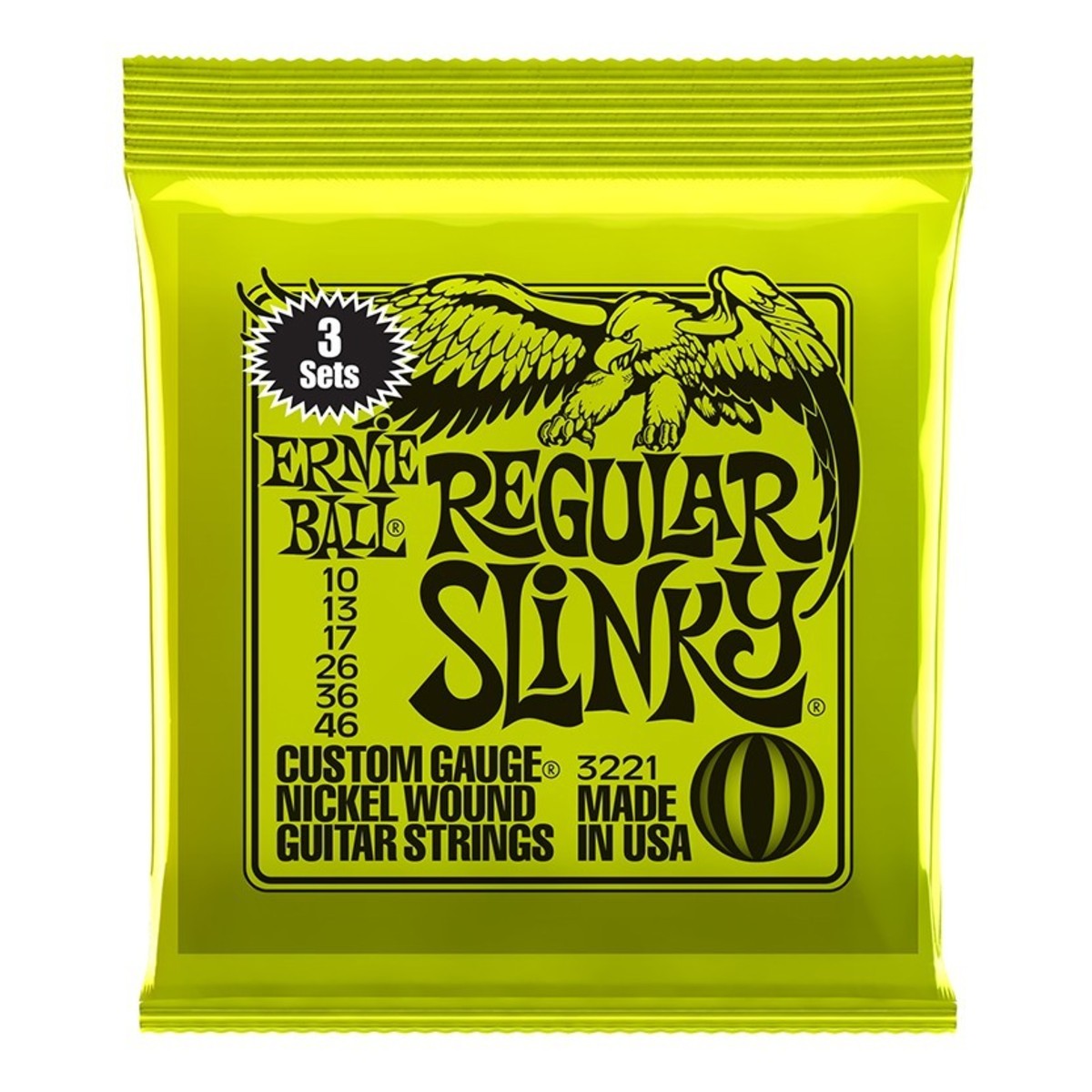 Blissful tone long-lasting lifespan. The Ernie Ball Regular Slinky Electric Guitar Strings come in a pack of three sets and are infused with world class Ernie Ball quality – because it matters. Designed specifically to bring tonal balance and brilliant brightness you know the Regular Slinky Strings provide the quality you can count on performance after performance. Plus with this handy set of three packs you can keep stocked up on your favourite set of strings too. Slinkys are also are the string of choice for many professional artists including Eric Clapton Jimmy Page Slash Angus Young John Mayer John Petrucci Steve Lukather and Steve Morse – legendary.