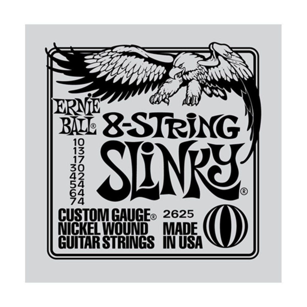 8-String Slinky Nickel Wound .010 – .074 Grey pack – The Ernie Ball Company was the first to offer rock strings with the creation of Slinkys and further revolutionized the market by offering guitarists Custom-Gauge single strings. Slinkys are the string of choice for many professional artists such as Eric Clapton Jimmy Page Slash Angus Young John Mayer John Petrucci Steve Lukather and Steve Morse.
